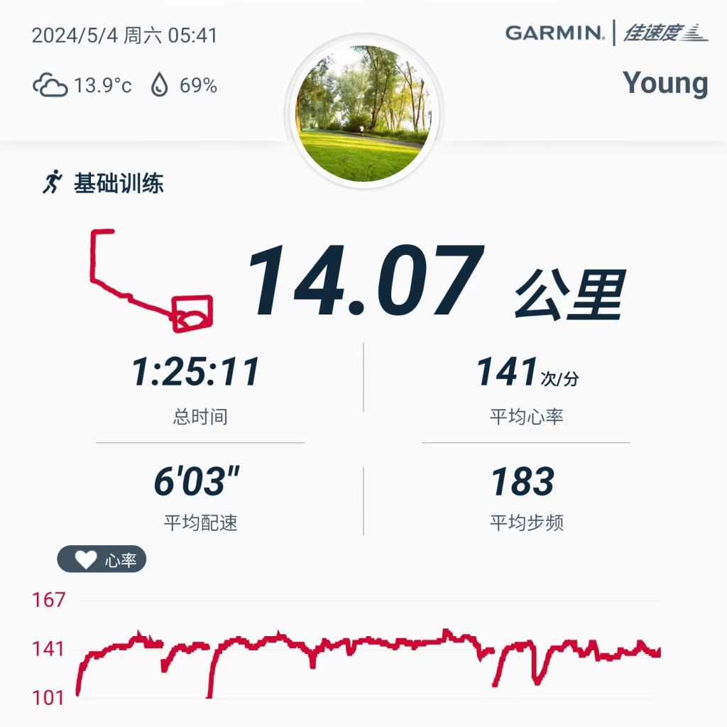 2024-05-04:慢跑14公里,心率控制的还算可以。