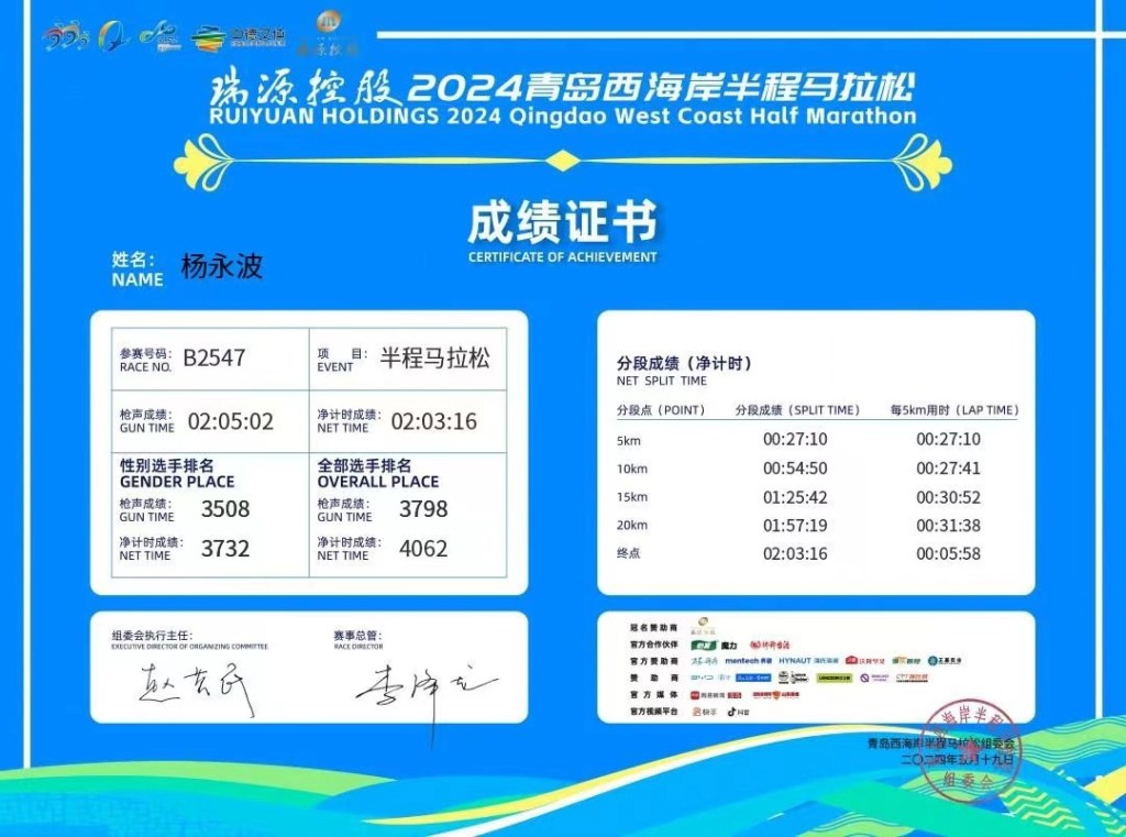 2024青岛西海岸半程马拉程顺利完赛,净成绩2小时3分!