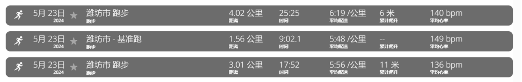 热身3公里,基准跑5分钟,恢复4公里。